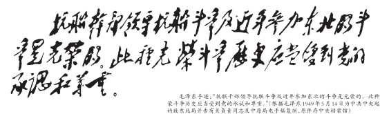 毛泽东手迹:“抗联干部领导抗联斗争及近年参加东北的斗争是光荣的。此种光荣斗争历史应当受到党的承认和尊重。”(根据毛泽东1949年5月14日为中共中央起草的致东北局并告有关负责同志及中原局电手稿复制,原件存中央档案馆)