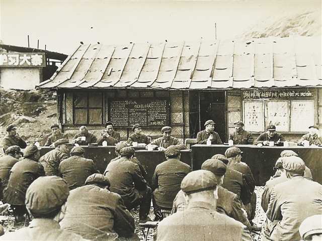 图为工程修建期间,开会布置任务。(涪陵“816”景区供图)